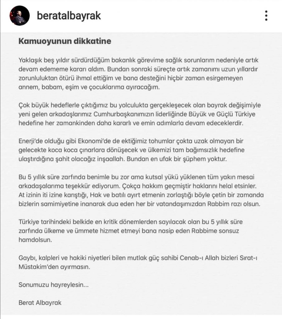 Hazine ve Maliye Bakanı Berat Albayrak'ı İnstegraö hesabından yapılan paylaşımda, Albayrak'ın sağlık sorunları sebebiyle görevinden istifa ettiği ifade edildi. Konuya ilişkin bakanlıktan henüz resmi bir açıklama yapılmazken, Albayrak'ın Twitter hesabına ulaşılamadığı görüldü.