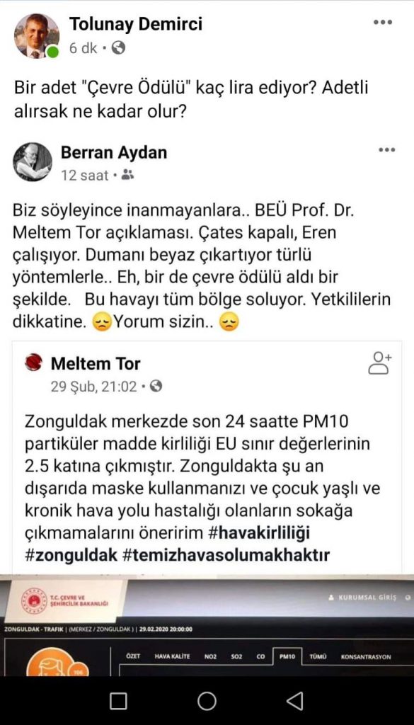 29 Şubat tarihinde sosyal paylaşım sitesinde vatandaşları maskesiz dışarı çıkma konusunda uyaran Pro. Dr. Meltem Tor’un paylaşımına TEMA Zonguldak İl Temsilcisi Berran Aydan yorum yaparak, “Çates kapalı, EREN çalışıyor. Dumanı beyaz çıkartıyor türlü yöntemlerle. Eh, bir de çevre ödülü aldı bir şekilde. Bu havayı tüm bölge soluyor. Yetkililerin dikkatine” diyerek eleştirirken, Tolunay Demirci adlı bir vatandaşta “Bir adet ‘Çevre ödülü’ kaç lira ediyor? Adetli alırsak ne kadar olur?” diyerek EREN Enerji ile dalga geçti.