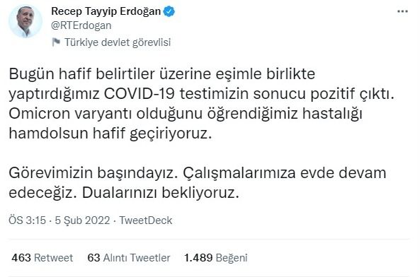 Cumhurbaşkanı Recep Tayyip Erdoğan'ın Zonguldak'a gelmeyişinin sebebi belli oldu. Cumhurbaşkanı Erdoğan ve eşi Emine Erdoğan koronavirüse yakalandı. Cumhurbaşkanı Recep Tayyip Erdoğan tweter hesabında yapmış olduğu açıklamada; "Bugün hafif belirtiler üzerine eşimle birlikte yaptırdığım COVİD-19 testimizin sonucu pozitif çıktı. Omicron varyantı olduğunu öğrendiğimiz hastalığı hamdolsun hafif geçiriyoruz. Görevimizin başındayız. Çalışmalarımıza evde devam edeceğiz. Dualarınızı bekliyoruz." ifadelerine yer verdi.