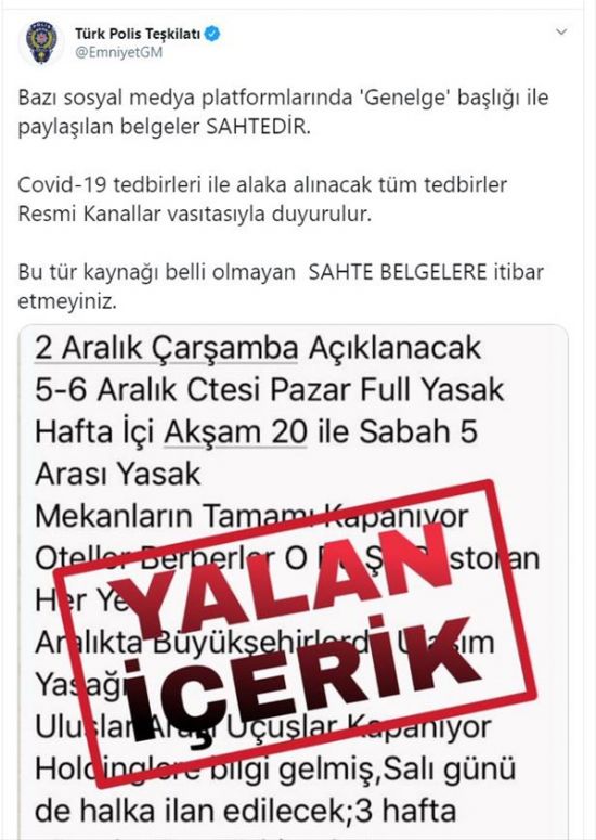 Emniyet Genel Müdürlüğü (EGM), bazı sosyal medya platformlarında paylaşılan ve sokağa çıkma yasağı ilan edileceği ileri sürülen "Genelge" başlıklı belgelerin sahte olduğunu bildirdi.