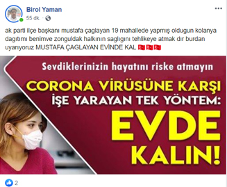 Bu duruma sosyal medyada tepkisini gösteren Ak Parti üyesi Birol Yaman; “Ak Parti ilçe başkanı Mustafa Çağlayan 19 mahallede yapmış olduğun kolonya dağıtımı benim ve Zonguldak halkının sağlığını tehlikeye atmaktır. Buradan uyarıyoruz. MUSTAFA ÇAGLAYAN EVİNDE KAL. Kamu adına soruyoruz. İlçe başkanı ve mahalle başkanları 19 mahallede Kolonya ve broşür dağıtımı yaptı. Şimdi asıl konu Mustafa Çağlayan ve 19 mahalle başkanları da 14 gün kuralına uyacak mı, uymayacak mı?