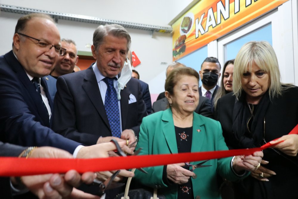 Köksal Toptan ve beraberindekiler açılışın anısına hatıra fotoğrafı çektirirken hediye takdiminde bulunuldu.