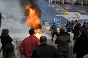 Zonguldak Gençlik ve Spor İl Müdürlüğü, Afet ve Acil Durum Müdürlüğü ile ortaklaşa yangın söndürme ve ikaz-alarm tahliye tatbikatı yapıldı. Zonguldak Gençlik ve Spor İl Müdürlüğü’nün talebi üzerine Afet ve Acil Durum Müdürlüğü tarafından Zonguldak Gençlik ve Spor İl Müdürlüğü yönetim ve personeline yönelik çok yönlü tatbikat gerçekleştirildi. İLK EĞİTİM SALONDA VERİLDİ Gençlik ve Spor İl Müdürlüğü personeline ve yöneticilerine ilk olarak konferans salonunda Afet ve Acil Durum Müdürlüğünden gelen uzmanlar eşliğinde Afet Farkındalık, Yangın Farkındalık ve KBRN Farkındalık konularında eğitimi verildi. AÇIK ALANDA YANGIN TATBİKATI YAPILDI Salonda gerçekleştirilen eğitimin ardından ise açık alanda yangın söndürme tatbikatı gerçekleştirildi. Uzman ekipler tarafından ilk olarak personele yangın tüpü kullanma teknikleri gösterilirken, yakılan ateşe personel müdahale ederek yangın söndürme tatbikatı yapıldı.
