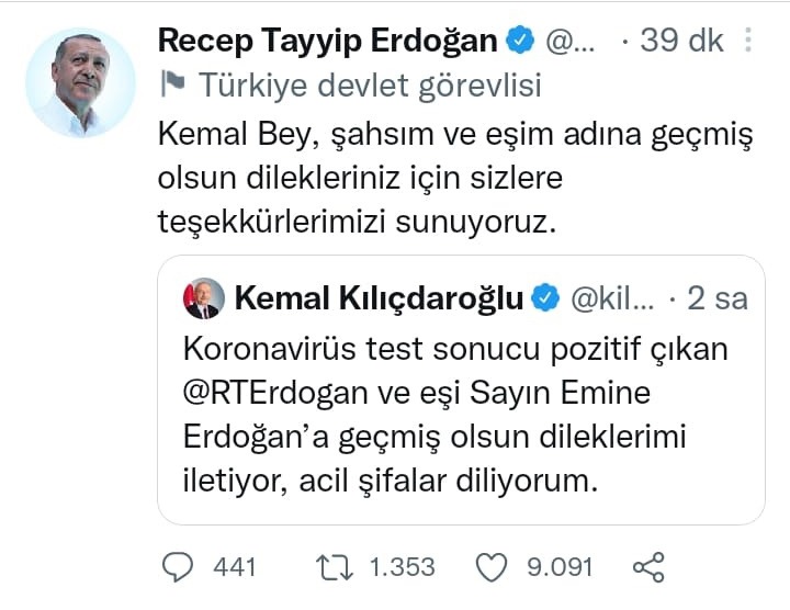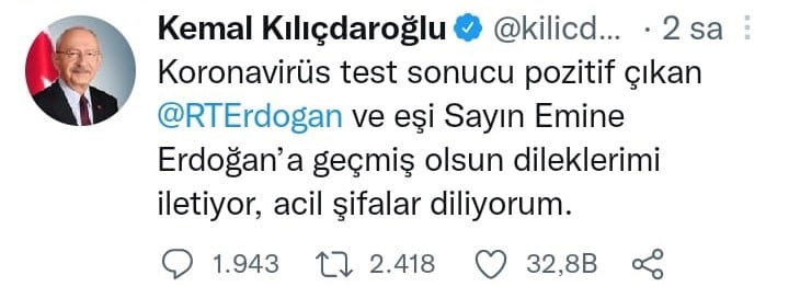 Kılıçdaroğlu yayınlamış olduğu mesajda; “Koronavirüs test sonucu pozitif çıkan Recep Tayyip Erdoğan ve eşi Sayın Emine Erdoğan’a geçmiş olsun dileklerimi iletiyor, acil şifalar diliyorum” dedi.
