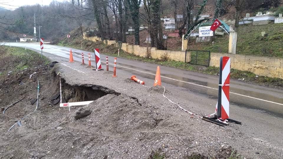 Zonguldak’ın Çaycuma ilçesinde eriyen kar suları derelerin taşmasına neden oldu. Taşan dere suyu anayolun altını boşaltınca heyelan meydana geldi.