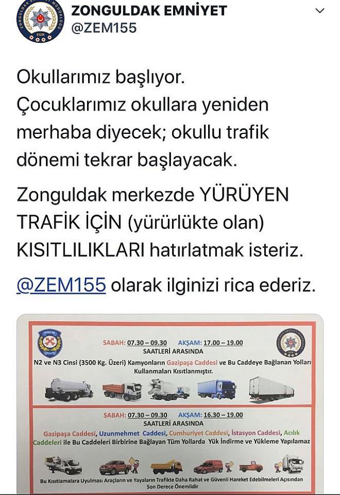 Zonguldak İl Emniyet Müdürü Metin Turalı, yarın açılacak okullar nedeniyle sosyal medya hesaabından yaptığı açıklama ile bazı hatırlatmalarda bulundu. Müdür Turanlı, yürüyen trafik için yürürlükte olan kısıtlılıkları hatırlatmak istediklerini ifade ederek, herkesi daha duyarlı olmaya davet etti.