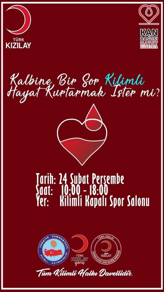 "Kan bağışı hayat kurtarır. Saygıdeğer Kilimlili vatandaşlarımızı 24 Şubat Perşembe günü yapılacak olan kan bağışı etkinliğine davet ediyoruz."