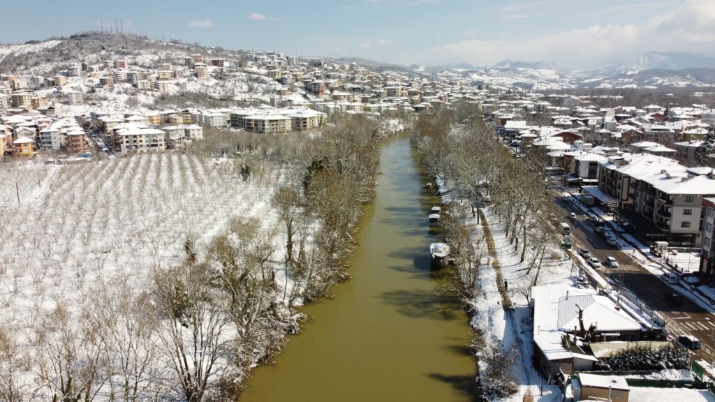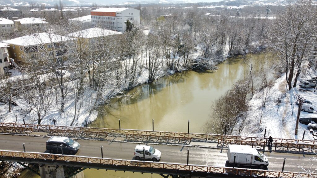 Batı Karadeniz Bölgesi’nde aralıklarla etkili olan kar yağışı Bartın’da eşsiz manzaralar ortaya çıkardı. Kent merkezinden geçerek Karadeniz’e dökülen Bartın Irmağı ve çevresinde oluşan manzara dron ile havadan görüntülendi.