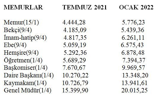 2022 memur maaşlarına yüzde 7,5 + 22,48 zam yapıldı. Yeni zamlarla birlikte en düşük memur maaşı 4 bin 444 liradan 5 bin 776 liraya çıktı.