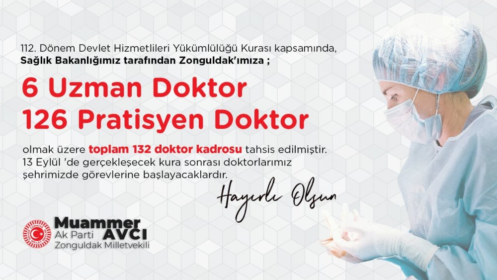 Zonguldak’a 132 doktorun atanacağı müjdesini veren AK Parti Zonguldak Milletvekili Muammer Avcı "Sağlık Bakan Yardımcımız Sn. Şuayip Birinci’ ye yaptığımız ziyarette gündeme getirdiğimiz talep kapsamında,112. Dönem Devlet Hizmetlileri Yükümlülüğü Kurası neticesinde, Sağlık Bakanlığımız tarafından Zonguldak'ımıza ; 6 Uzman ,126 Pratisyen Doktor olmak üzere toplam 132 doktor kadrosu tahsis edilmiştir.13 Eylül 'de gerçekleşecek kura sonrası doktorlarımız şehrimizde görevlerine başlayacaklardır. Bu görevlendirmeler için, Başta Sağlık Bakanımız Sn. Fahrettin Koca olmak üzere, Sağlık Bakanlığımızın ilgili tüm personeline şükranlarımızı arz ediyoruz. Şehrimizin sağlık hizmetlerine önemli katkı sunacak atamaların Zonguldak'ımıza hayırlı olmasını diliyoruz" dedi.