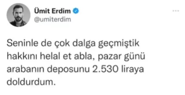 Başarılı oyuncu Ümit Erdim de fenomen olan gelin adayını paylaşarak helallik istedi. Twitter hesabından paylaşım yapan Erdim, "Seninle de çok dalga geçmiştik, hakkını helal et abla. Pazar günü arabanın deposunu 2.530 liraya doldurdum." yazdı.