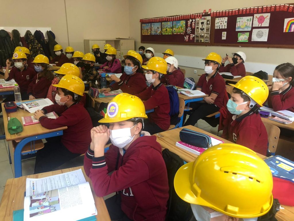 Gazi Ortaokulu öğrencileri 4 Aralık Dünya Madenciler Günü sonrası farkındalık oluşturmak amacıyla derse madenci baretleriyle katıldı.