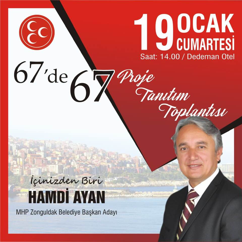 Milliyetçi Hareket Partisi Zonguldak Belediye Başkan Adayı Hamdi Ayan, 19 Ocak 2019 tarihinde saat 14 :00' Dedeman Otelde düzenleyeceği oturumla projelerinin birinci ayağını açıklayacak. Sosyal Paylaşım sitesinden oturumun duyurusunu yapan Ayan, tüm sevenlerini bu oturuma davet etti.