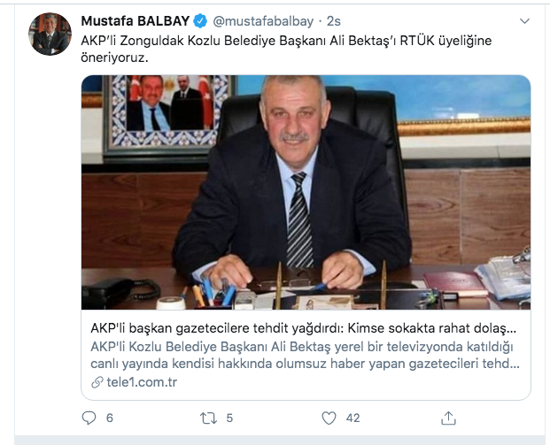 Balbay, twitter hesabında Ali Bektaş’ın tehdit haberini paylaşırken, “AKP’li Zonguldak Kozlu Belediye Başkanı Ali Bektaş’ı RTÜK üyeliğine öneriyoruz” diyerek alay etti.