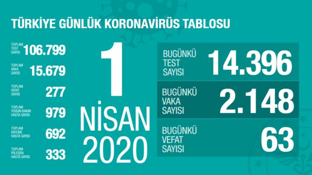 Son 24 saatte yapılan test sayısı 14 bin 396, vaka sayısı 2 bin 148. Hayatını kaybedenlerin sayısı 63. Toplam 333 hastamız iyileşti. Toplam hayatını kaybedenlerin sayısı 277 oldu.