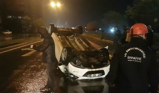 Zonguldak’ın Ereğli İlçesinde direksiyon hakimiyetini kaybeden alkollü sürücü takla attı.