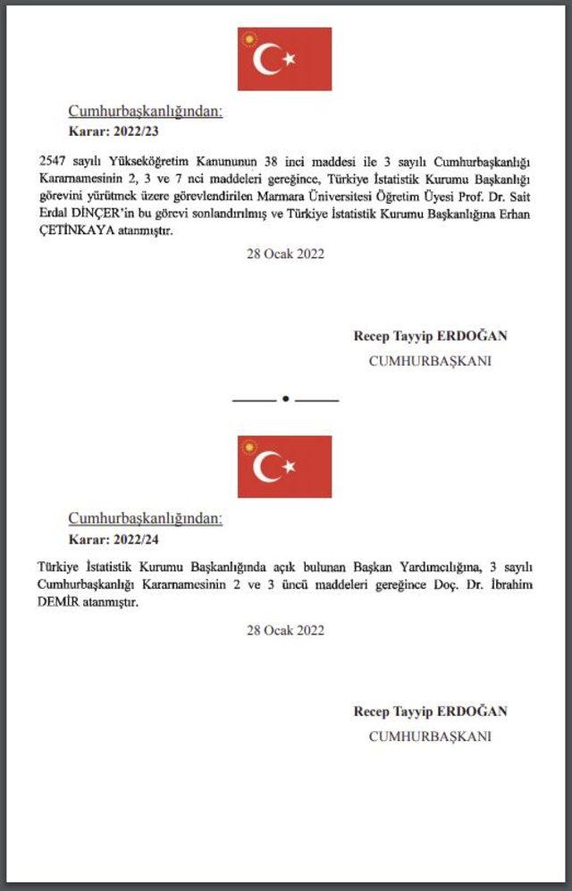 Cumhurbaşkanı Recep Tayyip Erdoğan'ın imzasıyla yayımlanan karara göre, Sait Erdal Dinçer görevi sonlandırılırken yerine Türkiye İstatistik Kurumu (TÜİK) Başkanlığı’na Erhan Çetinkaya atandı.