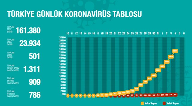 Toplam test sayısı 161 bin 380, toplam vaka sayısı 23 bin 934, toplam vefat sayısı 501, toplam yoğun bakım hasta sayısı 1311, toplam entübe hasta sayısı 909, toplam iyileşen hasta sayısı 786 oldu.