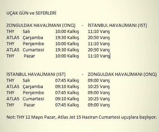 Zonguldak Havalimanı'ndan yurtiçi uçuş seferleri Pazar günü (12.05.2019) başlıyor. Yurtiçi uçuşların İstanbul aktarmalı olacağı belirtilirken haftanın 5 günü uçuş olacak...