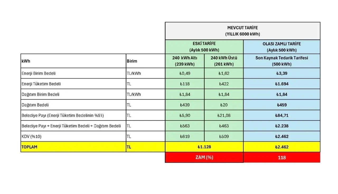 Yavuzyılmaz’ın açıklamasına göre, 2025 yılı içinde toplam elektrik tüketimi 3 bin kWh’yi geçen, yani yıllık elektrik faturası 8 bin TL’yi aşan konut aboneleri, mevcut sabit fiyatlı tarifeden çıkarılarak piyasa fiyatlarına bağlı değişken tarifeye geçirilecek. Bu uygulamanın, milyonlarca hanede elektrik faturalarının ciddi oranda artmasına yol açacağını vurgulayan Yavuzyılmaz, “Vatandaşa yeni bir elektrik faturası tuzağı kuruluyor” ifadelerini kullandı.