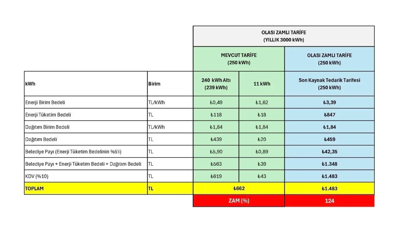 Şu anda aylık elektrik tüketimi 250 kilovatsaat olan bir konut abonesinin, aylık 662 TL gelen elektrik faturası, 2026 yılında 1.483 TL’ye yükselecek!