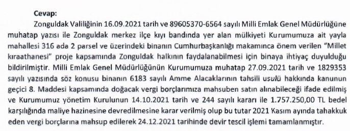 Söz konusu yanıtta, TMMOB Maden Mühendisleri Odası Zonguldak Şubesi binasının 1.757.250,00 TL bedel karşılığında devredildiği ilk defa TTK tarafından kabul edilip, resmi olarak açıklanırken, Milli Emlak’ın 27.09.2021 tarihinde binaya talip olduğu, TTK yönetim kurulunun ise 14.10.2021 tarihinde binayı devretme kararı aldığı belirtildi.
