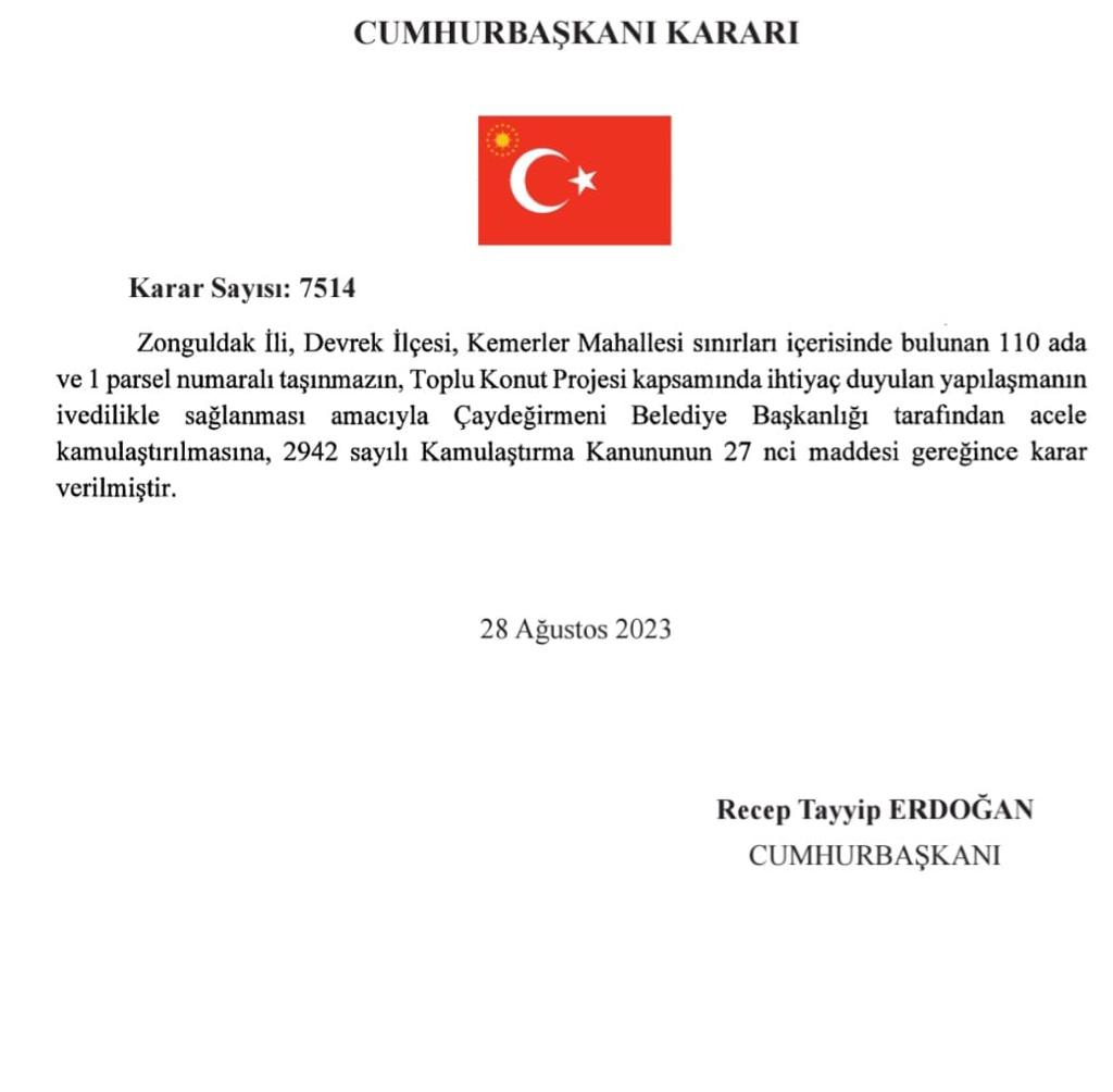 Cumhurbaşkanı Recep Tayyip Erdoğan imzasıyla Resmi Gazete'de yayımlanan kararlara göre, Zonguldak'ın Devrek ilçesi Kemerler Mahallesi sınırları içerisinde bulunan taşınmaz, Toplu Konut Projesi kapsamında ihtiyaç duyulan yapılaşmanın ivedilikle sağlanması amacıyla Çaydeğirmeni Belediye Başkanlığı tarafından acele kamulaştırılacak.