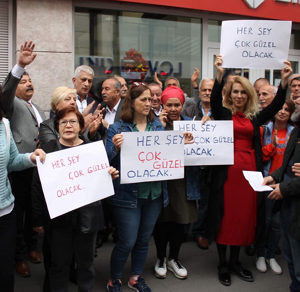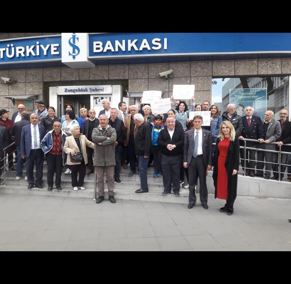 Ellerinde "Herşey güzel olacak" pankartlarıyla İş Bankası önünde toplanan partililer ve Ekrem İmamoğlu destekçileri, Ekrem İmamoğlu için açılan hesaba para yatırdı.