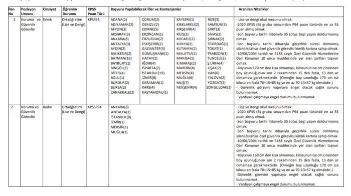 Kültür ve Turizm Bakanlığı 500 sözleşmeli personel alacak. 2020 KPSS (B) grubu puan sıralaması esas alınacak personelin kadro dağılımı 400 koruma ve güvenlik görevlisi ile 100 destek personeli (temizlik görevlisi) şeklinde olacak. Alım için yazılı ve sözlü sınav yapılmayacak. Zonguldak ili içerisinde 2 güvenlik görevlisi alınacağı öğrenildi.