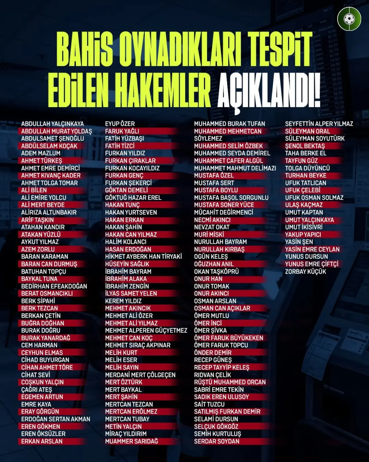 Bahisçi 7 hakem ve 15 yardımcısının Süper Lig ve 1. Lig'de maç yönettiği ortaya çıktı. 42 hakemin ayrı ayrı binin üzerinde maçta bahis oynadığı anlaşıldı. Bir hakemin tek başına 18 binden fazla bahis oynadığı tespit edildi.