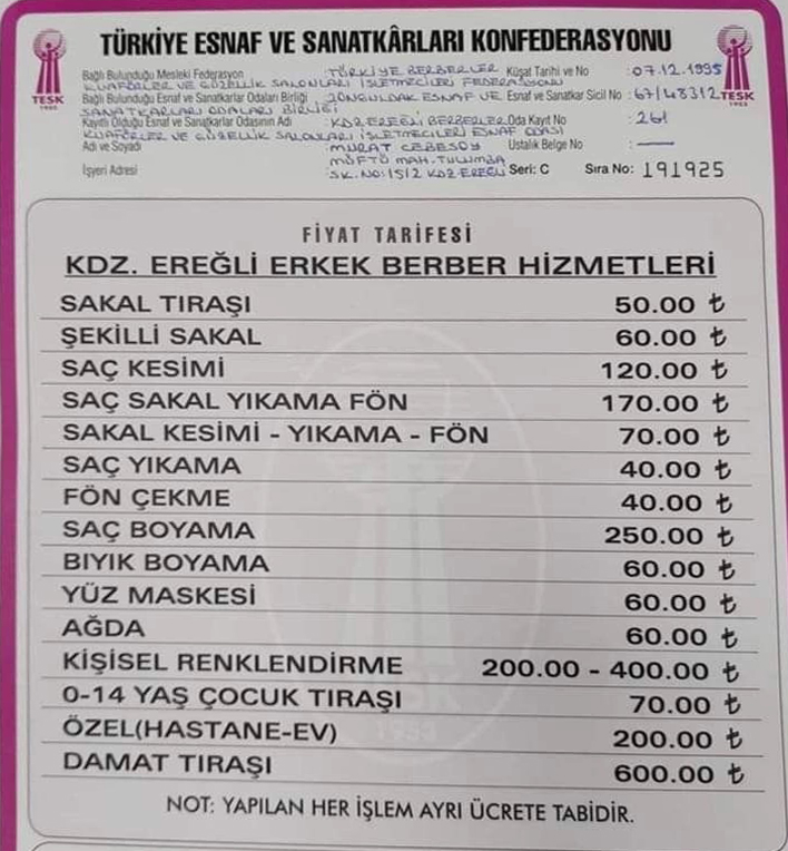 Türkiye Esnaf ve Sanatkarlar Konfederasyonunun belirlediği rakamlar doğrultusunda Karadeniz Ereğli'de Erkek Kuaförlerindeki tıraşa zam geldi.
