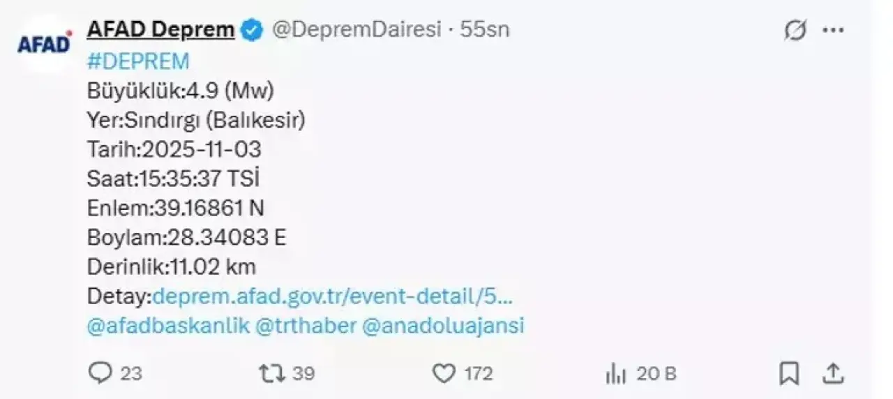 AFAD verilerine göre, depremin merkez üssü Sındırgı olarak belirlendi ve sarsıntı 11,02 kilometre derinlikte gerçekleşti.