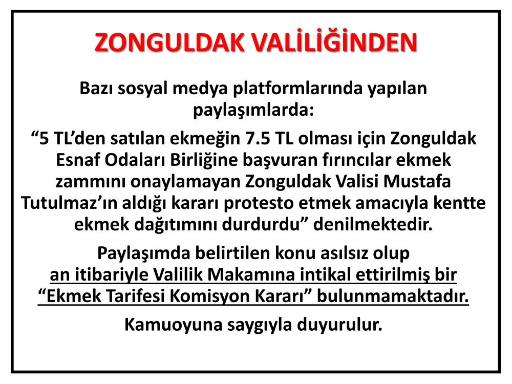 "Bazı sosyal medya platformlarda yapılan paylaşımlarda, 5 TL'den satılan ekmeğin 7.5 TL olması için Zonguldak Esnaf Odaları Birliği'ne başvuran fırıncılar ekmek zammını onaylamayan Zonguldak Valisi Mustafa Tutulmaz'ın aldığı kararı protesto etmek amacıyla kentte ekmek dağıtımını durdurdu' denilmektedir. Paylaşımda belirtilen konu asılsız olup an itibariyle Zonguldak Valilik Makamına intikal ettirilmiş bir ekmek tarifesi komisyon kararı bulunmamaktadır" ifadelerine yer verildi.
