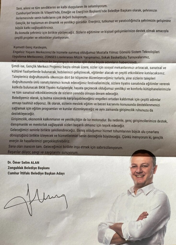 Zonguldak Belediye Başkanı ve Cumhur İttifakı Belediye Başkan Adayı Ömer Selim Alan, seçim tarihinin yaklaşmasıyla birlikte oy almak uğruna gençlerin ev adreslerine mektup göndererek, “Belediyemiz olarak, iş bulma sürecinde karşılaşabileceğiniz engelleri ortadan kaldırmak için çeşitli adımlar atmayı taahhüt ediyoruz” şeklinde vaatlerde bulunması dikkat çekti.