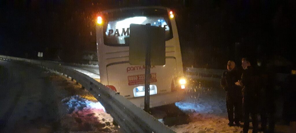 Kaza, saat 22.00 sıralarında Zonguldak-Ereğli karayolunun Delihakkı rampaları mevkiinde meydana geldi. Edinilen bilgiye göre Zonguldak istikametine giden Pamukkale Turizm'e ait yolcu otobüsü karlı yolda kayarak bariyerlere yaslandı. Yaklaşık 15 yolcunun bulunduğu otobüste yaralanan olmazken, Karayolları ekipleri otobüsü bulunduğu yerden çıkartmak için çalışma başlattı.