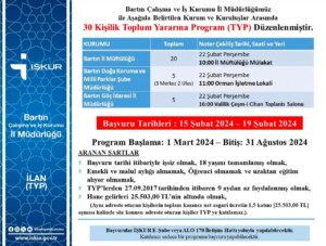 Toplum Yararına Program (TYP) kapsamında 30 kişinin istihdam edileceği duyuruldu. Başvuru esasları ise şu şekilde;