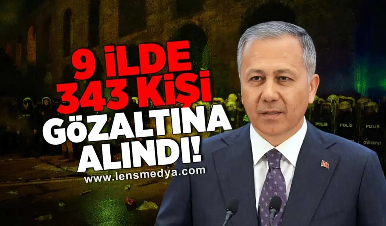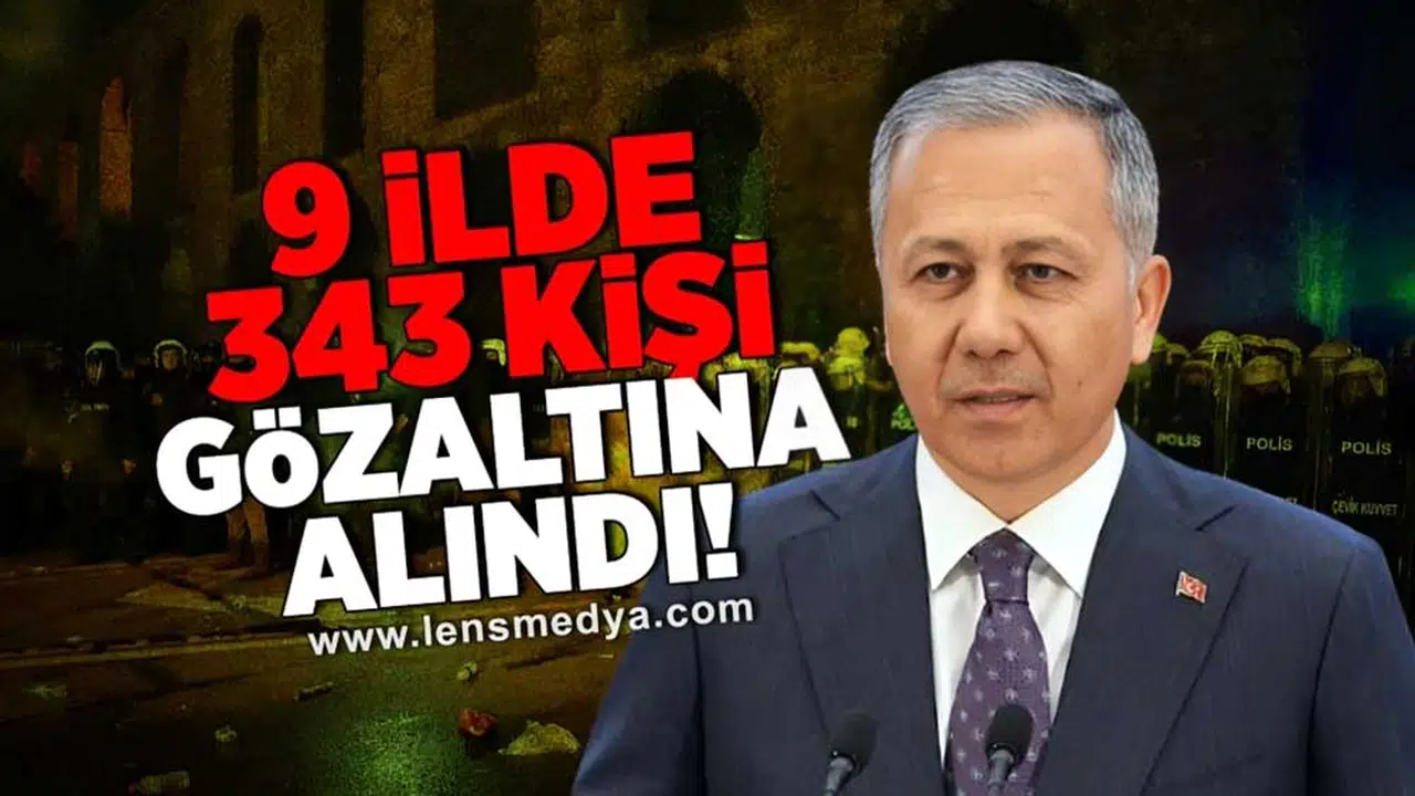 Gözaltına alınan İmamoğlu için dördüncü gün de vatandaşlar Saraçhane başta olmak üzere yurdun farklı noktalarında protestolar düzenliyor. Protestolarla ilgili Bakan Yerlikaya sosyal medya hesabından paylaşımda bulundu. 9 İLDE 343 KİŞİ GÖZALTINDA Bakan Yerlikaya'nın paylaşımı şu şekilde: "İstanbul Cumhuriyet Başsavcılığınca yürütülen İstanbul Büyükşehir Belediyesi soruşturması ile ilgili dün gece İstanbul, Ankara, İzmir, Adana, Antalya, Çanakkale, Eskişehir, Konya ve Edirne’de meydana gelen eylemlerde 343 şüpheli yakalandı. Toplumsal düzeni bozmaya, milletimizin huzurunu ve güvenliğini tehdit etmeye, kargaşa ve provokasyon peşinde koşanlara asla fırsat verilmeyecek, kesinlikle göz yumulmayacaktır. Huzur ve güvenliğimizin teminatı olan polislerimiz gece gündüz demeden görevlerinin başındalar"