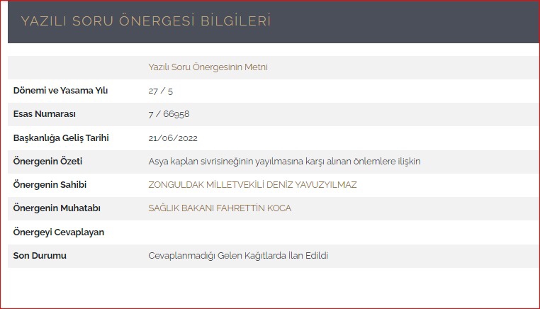 “Dünyayı tehdit eden iklim krizi ve beraberinde getirdiği ekolojik sorunlar, istilacı türlerin artmasına neden olurken, geçtiğimiz aylarda Zonguldak’ta Asya Kaplanı sivrisineği türünde son derece tehlikeli ve istilacı bir türün görülmesi üzerine konuyu Meclise gündemine taşıyarak ilgili Bakanlıklara çeşitli sorular yönetmiştik.