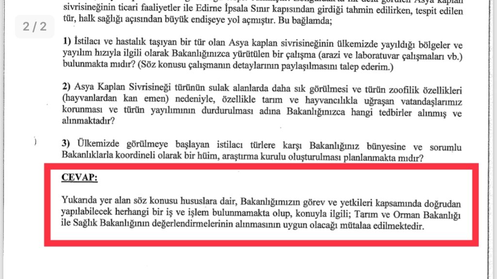 ‘Türkiye'deki Karasal Ortamlarda ve İç Sularda İstilacı Yabancı Türlerin Tehditlerinin Değerlendirilmesi Projesini’ yürüten Tarım ve Orman Bakanlığı ‘Önerge konusu hususlar Bakanlığımız görev ve yetki alanına girmemektedir’ diyor. Çevre Bakanlığı ise ‘konuyla ilgili Tarım ve Orman Bakanlığı ile Sağlık Bakanlığının değerlendirmelerinin alınmasının uygun olacaktır’ diyerek önergemizi yanıtlıyor.