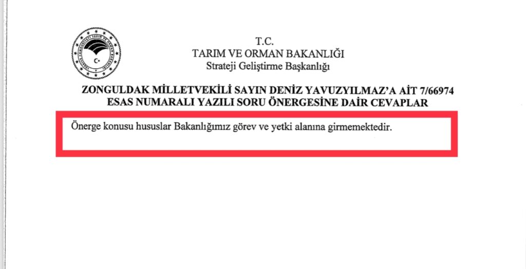 CHP’li Milletvekili, konuyla ilgili olarak Başta Tarım ve Orman Bakanlığı olmak üzere, 3 ayrı Bakanlığa soru önergelerini yönlendirirken, ilgili Bakanlıkların sorumluluğu birbirine attığı, önergelerin ise muhatapsız kaldığı ortaya çıktı.