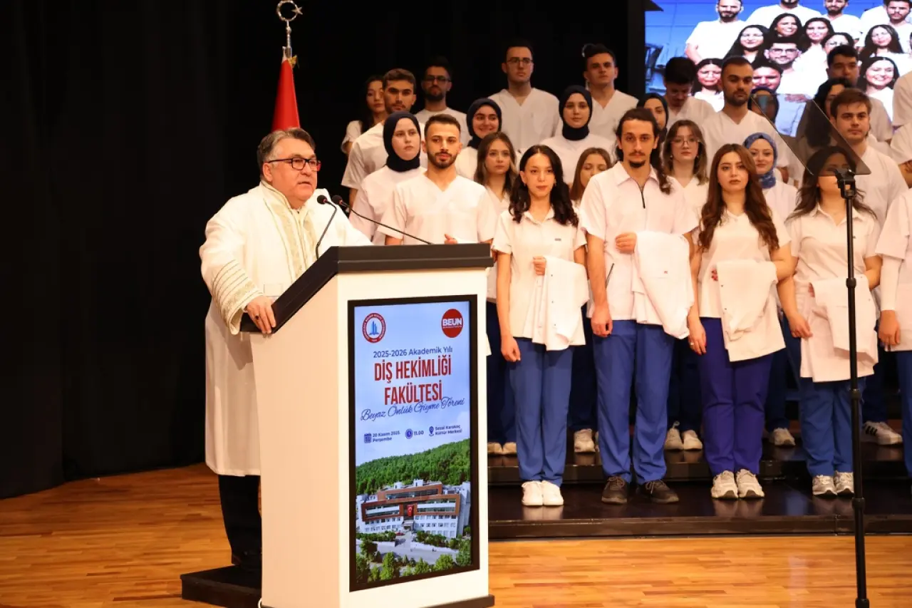 Program, saygı duruşu ve İstiklal Marşı’nın okunmasıyla başladı. Ardından kürsüye gelen Diş Hekimliği Fakültesi Dekanı, öğrencilerin beyaz önlük giymelerinin yalnızca bir tören olmadığını, aynı zamanda etik, empati ve insan sağlığına adanmışlık anlamı taşıdığını belirtti.