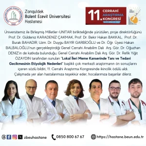 Zonguldak Bülent Ecevit Üniversitesi Tıp Fakültesi Hastanesi akademisyenleri “Lokal İleri Meme Kanserinde Tanı ve Tedavi Gecikmesinin Etiyolojik Nedenleri” başlıklı araştırması 11. Cerrahi Araştırma Kongresinde ikinci olurken ödül aldı. Bülent Ecevit Üniversitesi ile Birleşmiş Milletler-UNITAR birlikteliğinde yürütülen, proje direktörlüğünü Prof. Dr. Güldeniz Karadeniz Çakmak, Prof. Dr. Bekir Hakan Bakkal, Prof. Dr. Burak Bahadır, Uzm. Dr. Duygu Bayır Garbioğlu ve Dr. Öğr. Üyesi Hakan Balbaloğlu’nun gerçekleştirdiği Genel Cerrahi Anabilim Dalı Arş. Gör. Dr. Oğuzhan Deniz’in de katkıda bulunduğu, Genel Cerrahi Anabilim Dalı Arş. Gör. Dr. Refik Yiğit Özaydın tarafından sunulan “Lokal İleri Meme Kanserinde Tanı ve Tedavi Gecikmesinin Etiyolojik Nedenleri” başlıklı çok merkezli araştırmanın ön sonuçlarını içeren sözlü bildiri, 11. Cerrahi Araştırma Kongresinde ikincilik ödülü aldı.