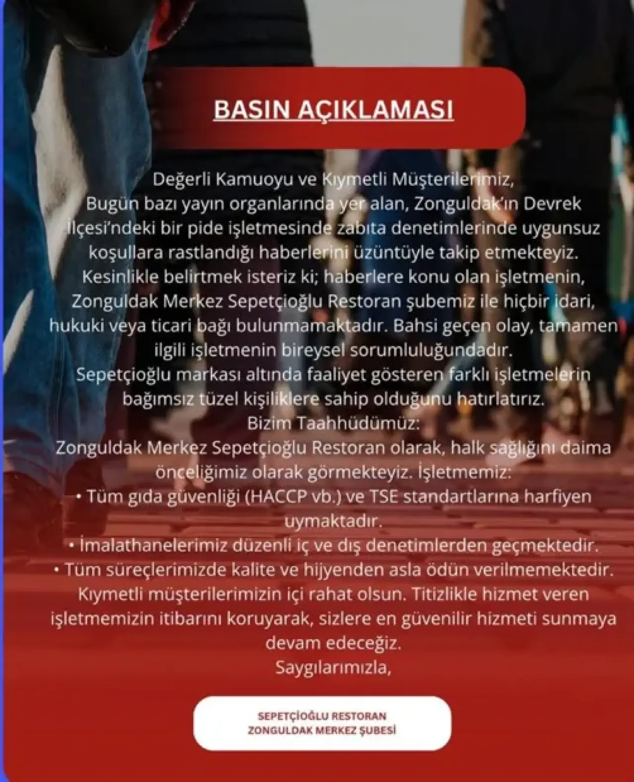 Zonguldak’ın Devrek ilçesinde zabıta ekiplerinin yaptığı denetimlerde bir pide işletmesinde hijyen açısından uygunsuz koşulların tespit edilmesi üzerine, bazı yerel medya organlarında “Sepetçioğlu” adıyla anılan işletmelerin gündeme gelmesinin ardından Zonguldak Merkez Sepetçioğlu Restoran’dan açıklama geldi.