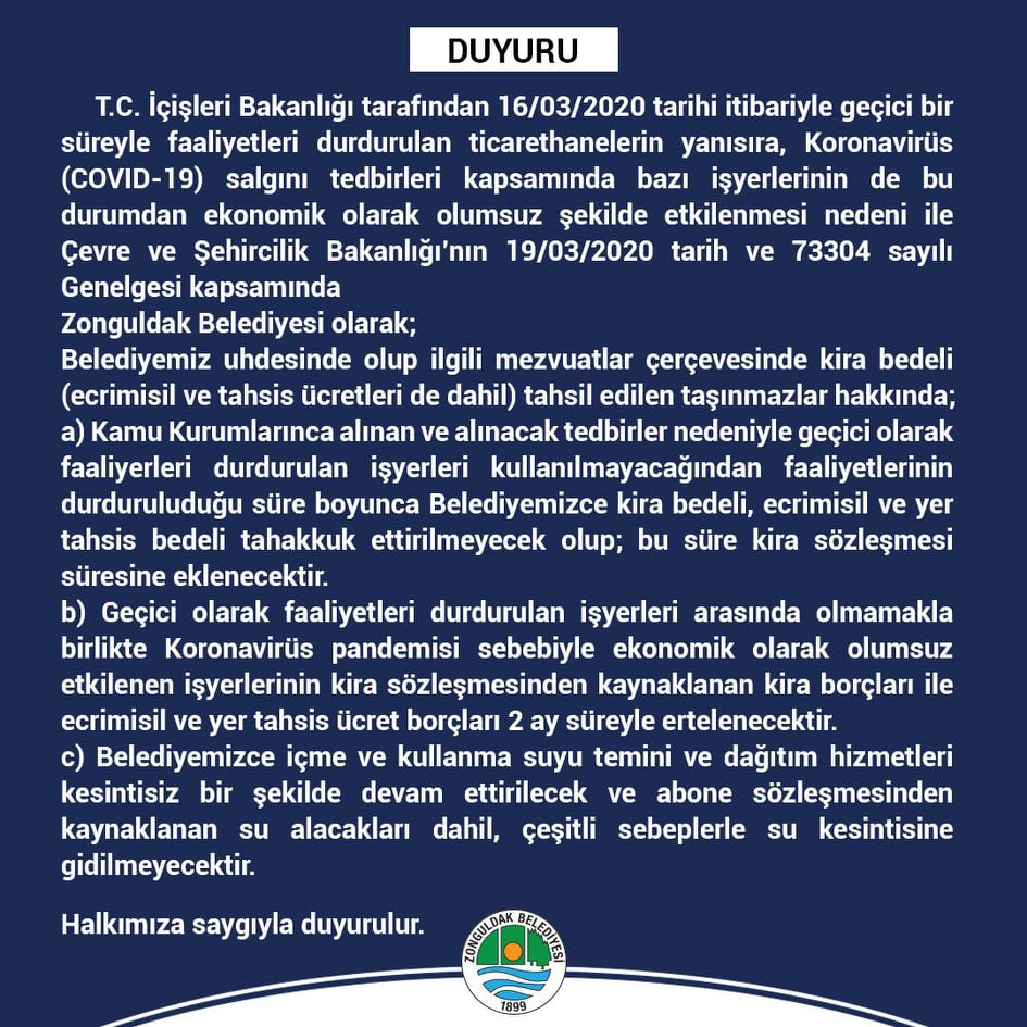 Zonguldak belediyesi corona virüsün Zonguldak’ta da görülmesinin ardından yazılı bir açıklama yayımladı. Açıklamada belediyeye ait iş yerlerinden kira ve ecri misil bedeli alınmayacağı bu sürenin kira sözleşmesi süresine ekleneceği ve su borcu olan abonelerin sularının kesilmeyeceğine dair bilgi verildi.