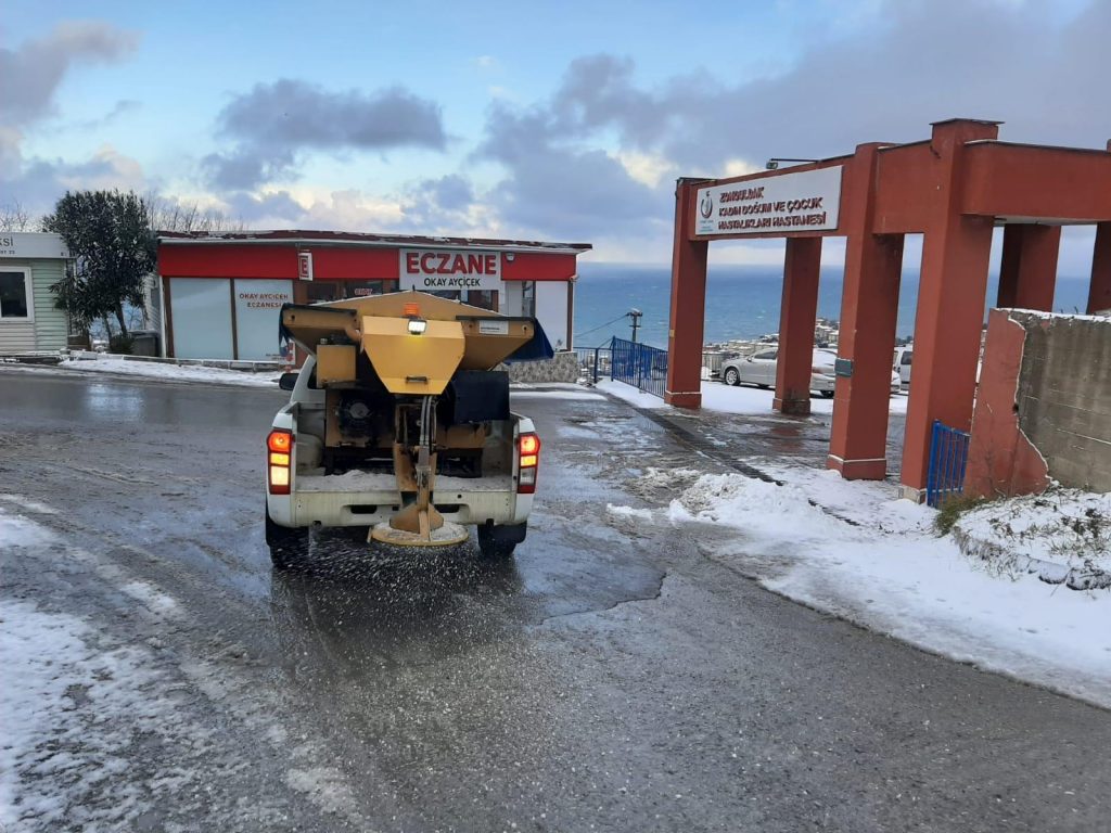 Zonguldak’ta etkisini gösteren kar yağışı sebebi ile Zonguldak Belediyesi Fen İşleri Müdürlüğü’ne bağlı ekipler tarafından Atatürk Devlet Hastanesi ve Kadın Doğum ve Çocuk Hastanesi’ne giden yollarda kar küreme çalışması yapılarak buzlanma ve don olaylarına karşı tuzlama çalışmaları yapıldı.