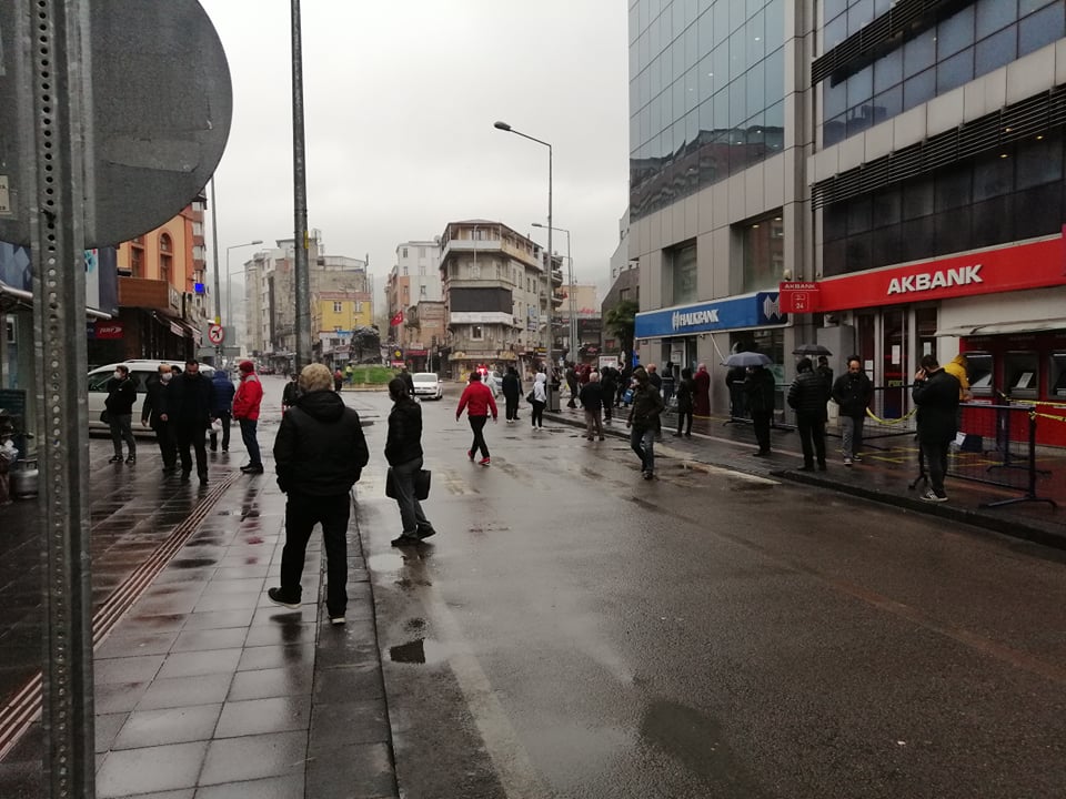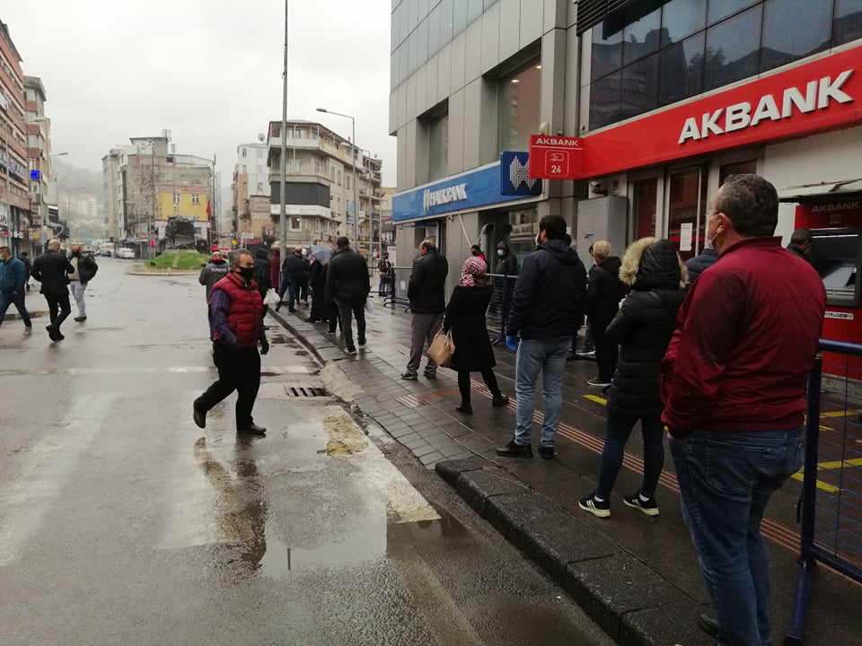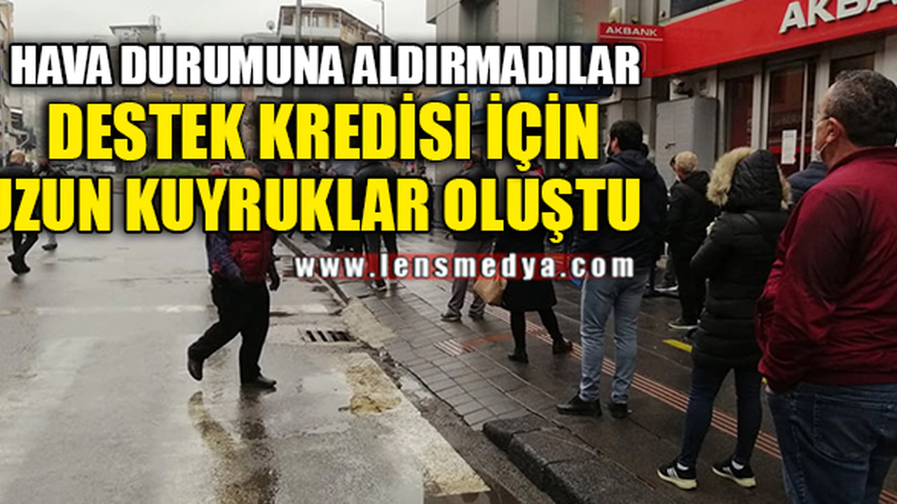 6 ay ödemesiz 36 ay vadeli kredi desteğinden yararlanmak isteyen vatandaşlar. Havaya aldırış etmeden sırada sosyal mesafeyi koruyarak beklemeye devam ediyor.