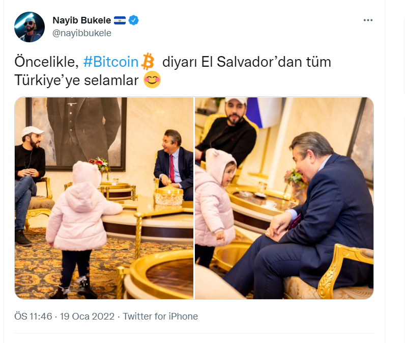 Bukele Türkiye'ye gelişini "Öncelikle Bitcoin diyarı El Salvador'dan tüm Türkiye'ye selamlar" tweetiyle duyurdu.