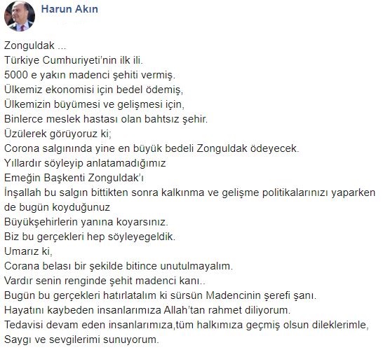 Harun Akın “İnşallah bu salgın bittikten sonra kalkınma ve gelişme politikalarınızı yaparken de bugün koyduğunuz büyükşehirlerin yanına koyarsınız.” İfadelerini kullanarak büyükşehirlerle birlikte Zonguldak’a da giriş çıkışların yasaklanması hakkında düşüncelerini paylaştı.