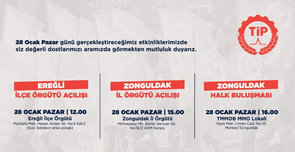 Türkiye İşçi Partisi (TİP) Genel Başkanı Erkan Baş'ın Zonguldak ziyaret programı belli oldu. Türkiye İşçi Partisi (TİP) Genel Başkanı Erkan Baş, Ereğli ilçe binası ve Zonguldak İl Binası açılışı için 27 Ocak Pazar (yarın) Zonguldak'a gelecek. Baş'ın Zonguldak programı şu şekilde: