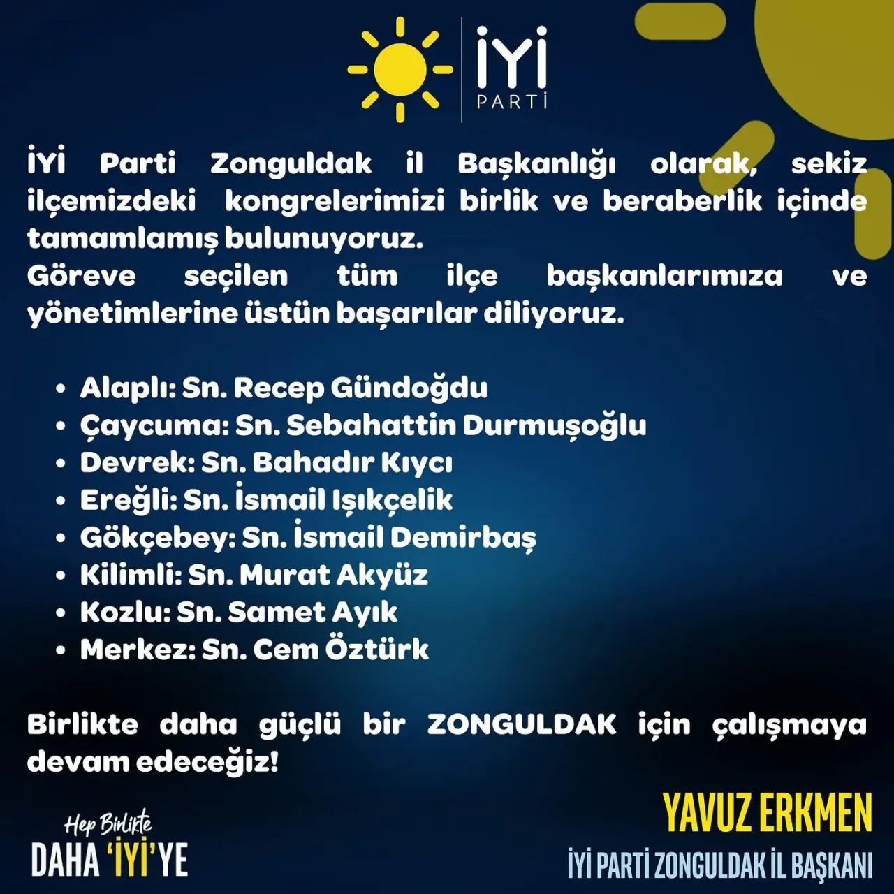 "İYİ Parti Zonguldak il Başkanlığı olarak, sekiz ilçemizdeki kongrelerimizi birlik ve beraberlik içinde tamamlamış bulunuyoruz. Göreve seçilen tüm ilçe başkanlarımıza ve yönetimlerine üstün başarılar diliyoruz.